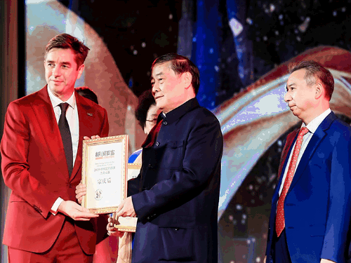 ▲海银金融控股集团董事长韩宏伟(右一)与胡润联袂为开润股份董事长范劲松颁发“2019产业领袖”奖