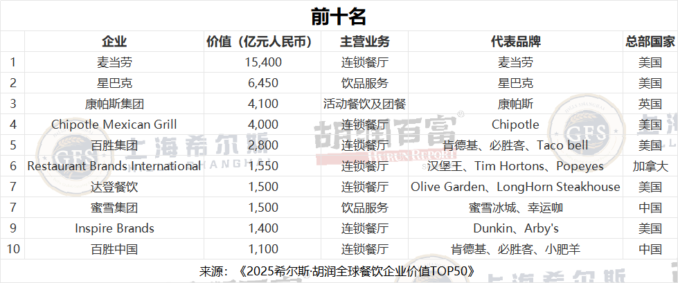 《2025希尔斯·胡润全球餐饮企业价值TOP50》