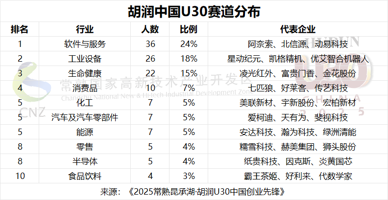 上榜U30中,最受欢迎的赛道前三名分别是软件与服务(占比24%)、工业设备(占比18%)以及生命健康(占比15%)。相比去年,工业设备和生命健康两大硬科技赛道显著上升。