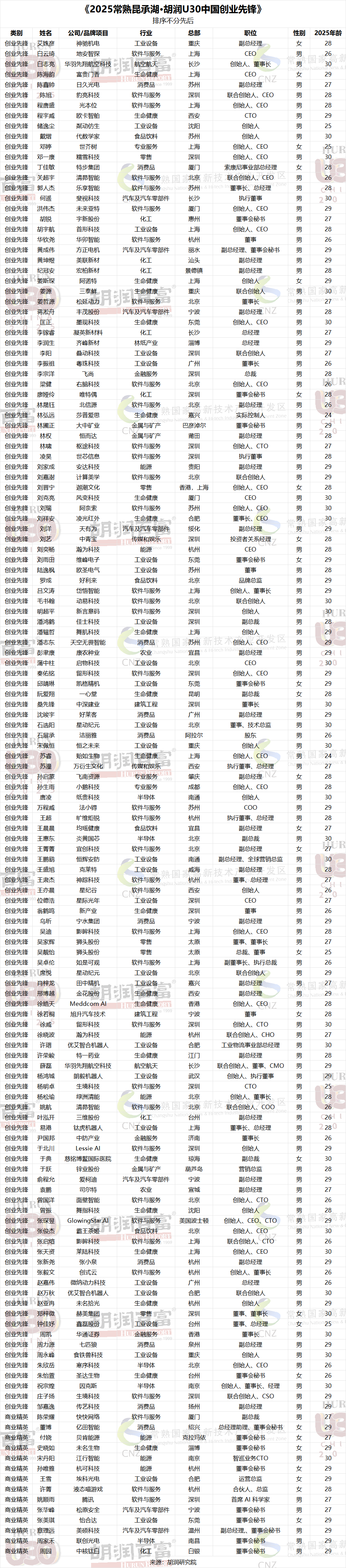 胡润研究院携手常熟昆承湖,今日联合发布《2025常熟昆承湖·胡润U30中国创业先锋》(Changshu Kuncheng Lake · Hurun China Under30s 2025),旨在寻找中国30岁及以下的创业先锋。这是胡润研究院第九次发布该榜单。今年榜单在“创业先锋”基础上新增“商业精英”类别,以表彰表现突出的企业高管。