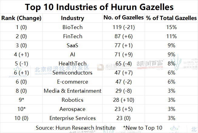 BIOTECH LED THE WAY WITH 119 HURUN GAZELLES, FOLLOWED BY FINTECH 87, SAAS 77, ARTIFICIAL INTELLIGENCE 71, AND HEALTHTECH 65.