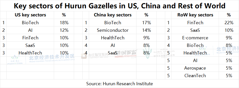 The key sectors for Hurun Gazelles in the US were BioTech and AI. In China, it was BioTech and Semiconductors, while for the Rest of the World it was FinTech and SaaS.
