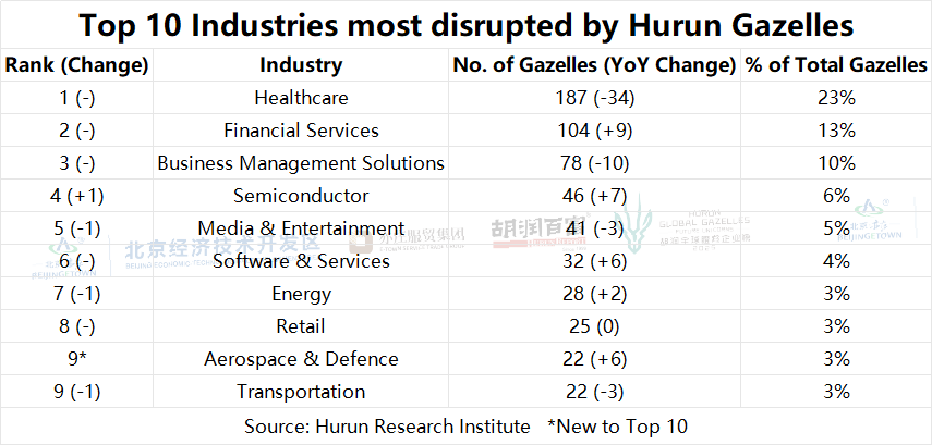 HEALTHCARE, WITH 187 HURUN GAZELLES, MOST DISRUPTED SECTOR, FOLLOWED BY FINANCIAL SERVICES WITH 104 AND BUSINESS MANAGEMENT SOLUTIONS WITH 78.