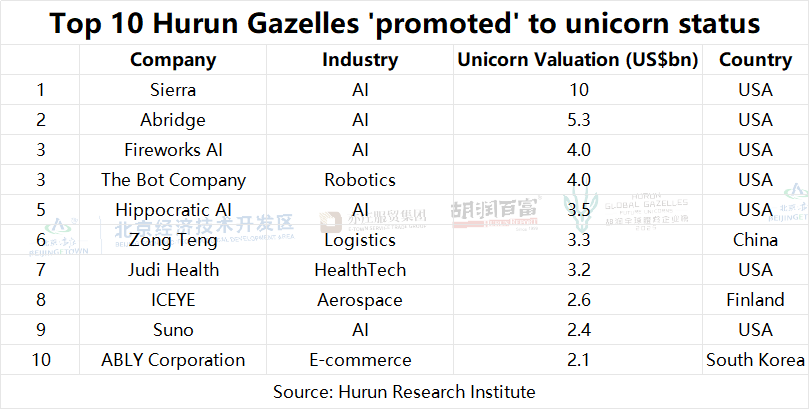 71 Hurun Gazelles were promoted to the Hurun Global Unicorns Index 2025, led by USA-based enterprise AI company Sierra valued around US$10bn in late 2025 by proving that its ‘AI agents’ could go beyond simple chatbots to autonomously perform complex enterprise tasks for clients.