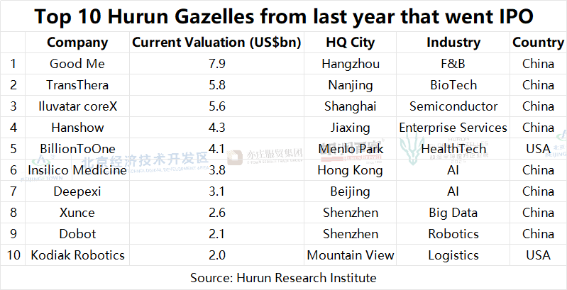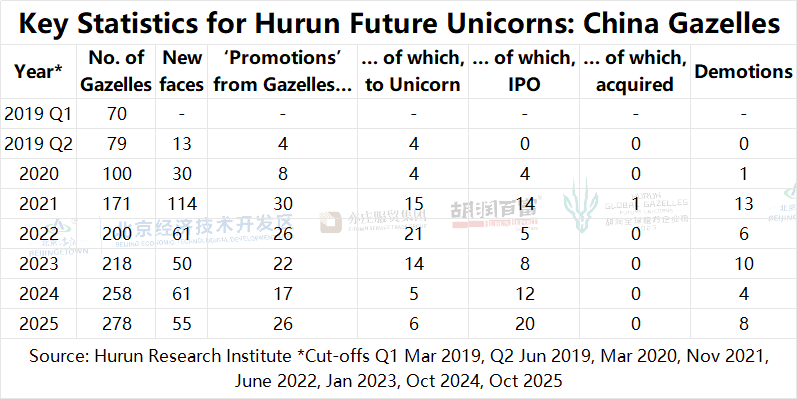China. Since 2019, China has seen the number of Hurun Gazelles more than tripling from 70 to 278. In these five years, there have been 384 new faces, 133 promotions, of which 69 went unicorn, 63 went IPO and 1 was acquired. 42 were demoted.