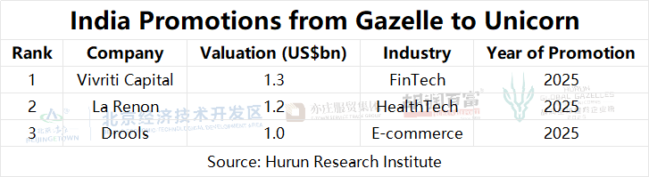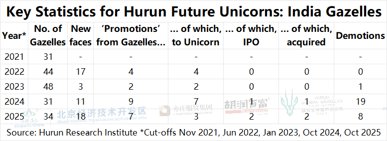 India. The Hurun Global Gazelles list in 2025 features 18 new faces from India. Over the course of the year, 7 companies were promoted, with 2 going public through an IPO, 3 reaching unicorn status, and 2 being acquired. 8 companies from India were demoted.