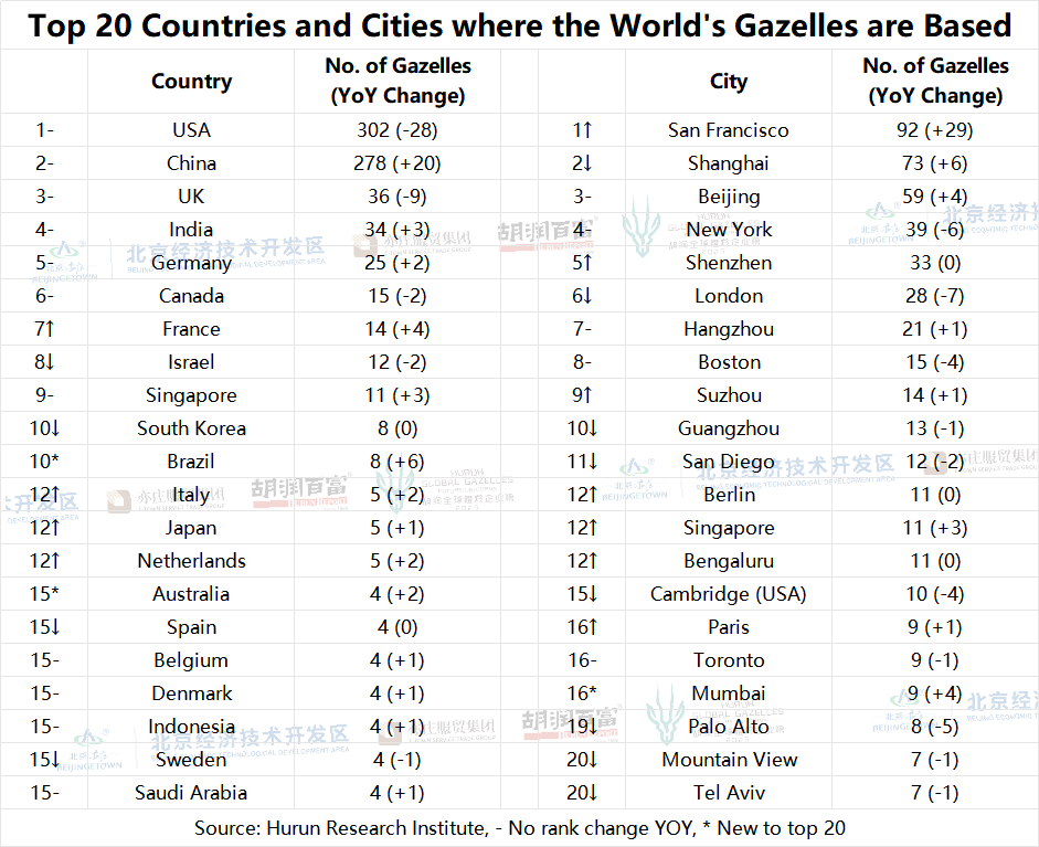 The USA and China led with 302 and 278 Hurun Gazelles, making up 71% of the global total. The UK was third with 36, down 9, followed by India with 34, up 3.