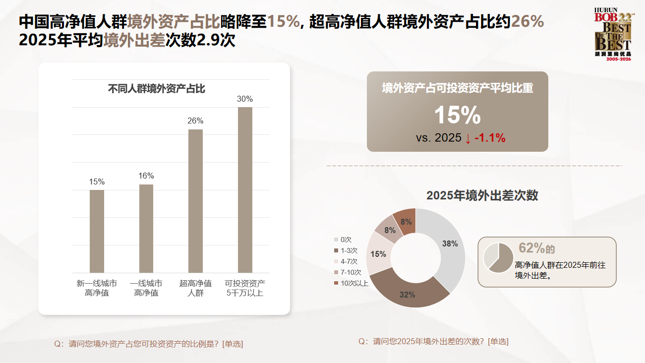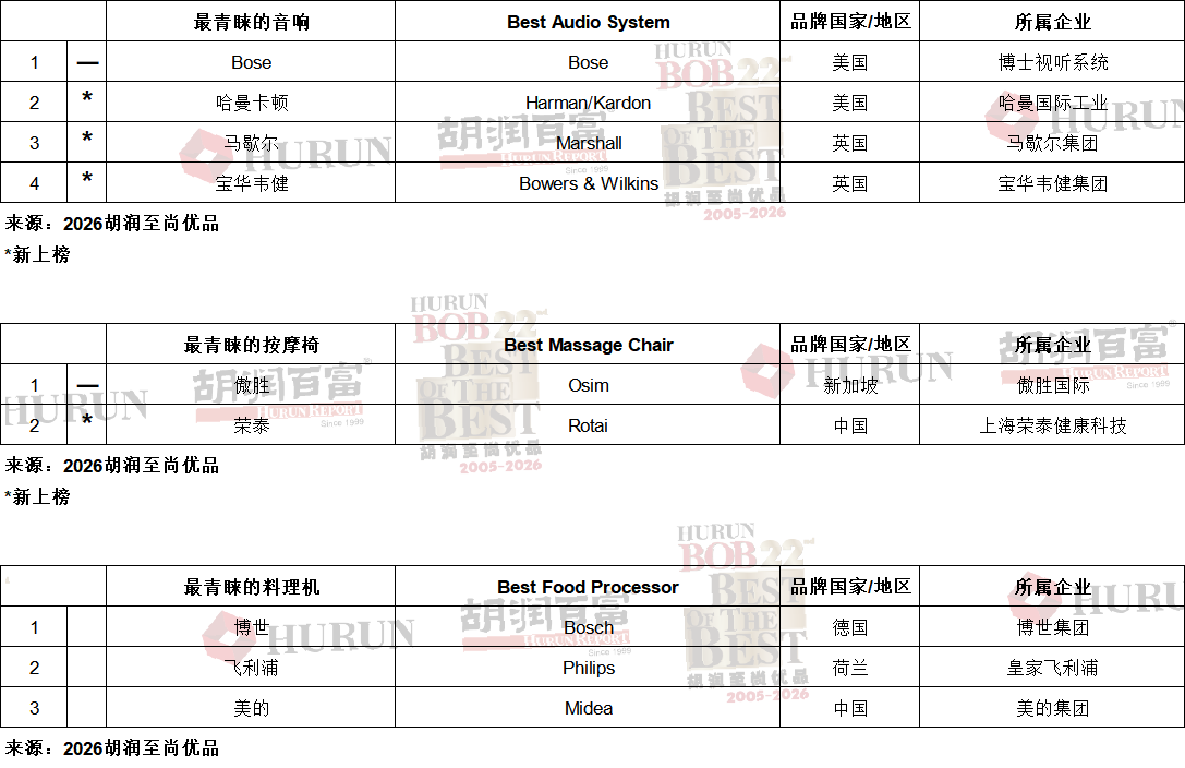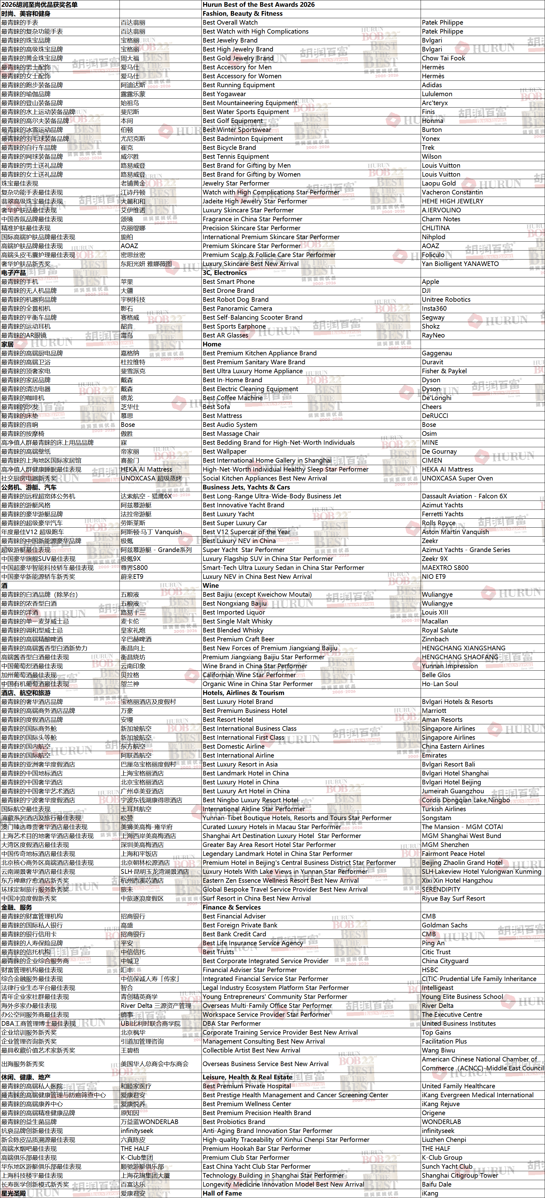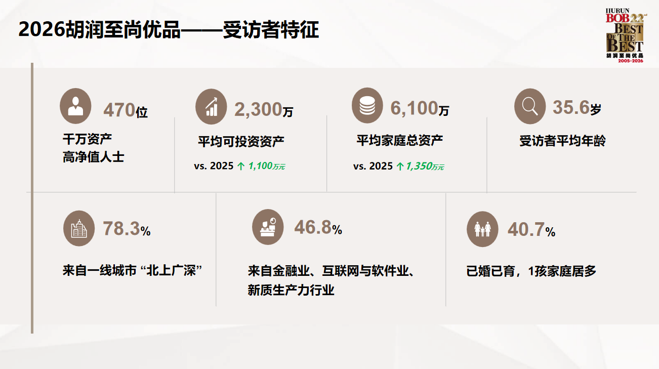 胡润研究院今日发布《2026胡润至尚优品——中国高净值人群品质生活报告》(Hurun Chinese Luxury Consumer Survey & Hurun Best of the Best Awards 2026)(以下简称胡润至尚优品报告)。这是胡润研究院连续第22年发布此报告,旨在揭示中国高净值人群的生活方式、消费习惯以及品牌认知的转变与偏好,力图对中国高净值人群的生活形态变化做出描述。“胡润至尚优品”被广泛认为是面向高净值人群品牌的ISO。