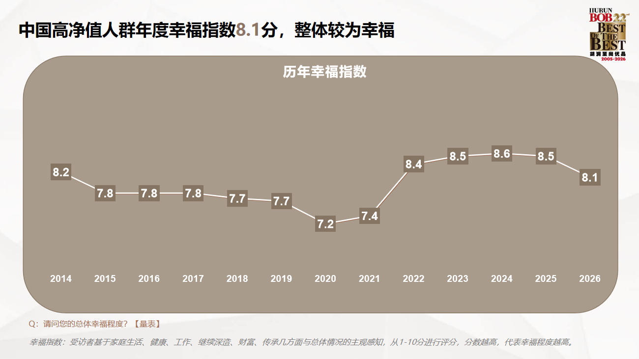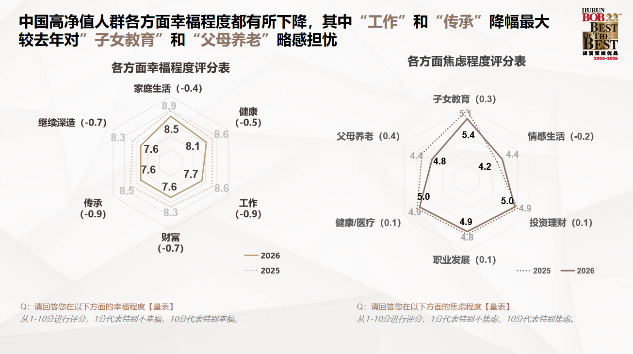 总体幸福指数8.1分,整体较为幸福,其中,家庭生活方面的满意度最高。工作满意度和传承满意度下降了0.9分,继续深造满意度和财富满意度下降了0.7分,家庭生活满意度和健康满意度降幅最小,分别下降了0.4分和0.5分。与去年相比,受访者的焦虑程度并无明显变化,但相较于去年,他们对“子女教育”和“父母养老”略感担忧。