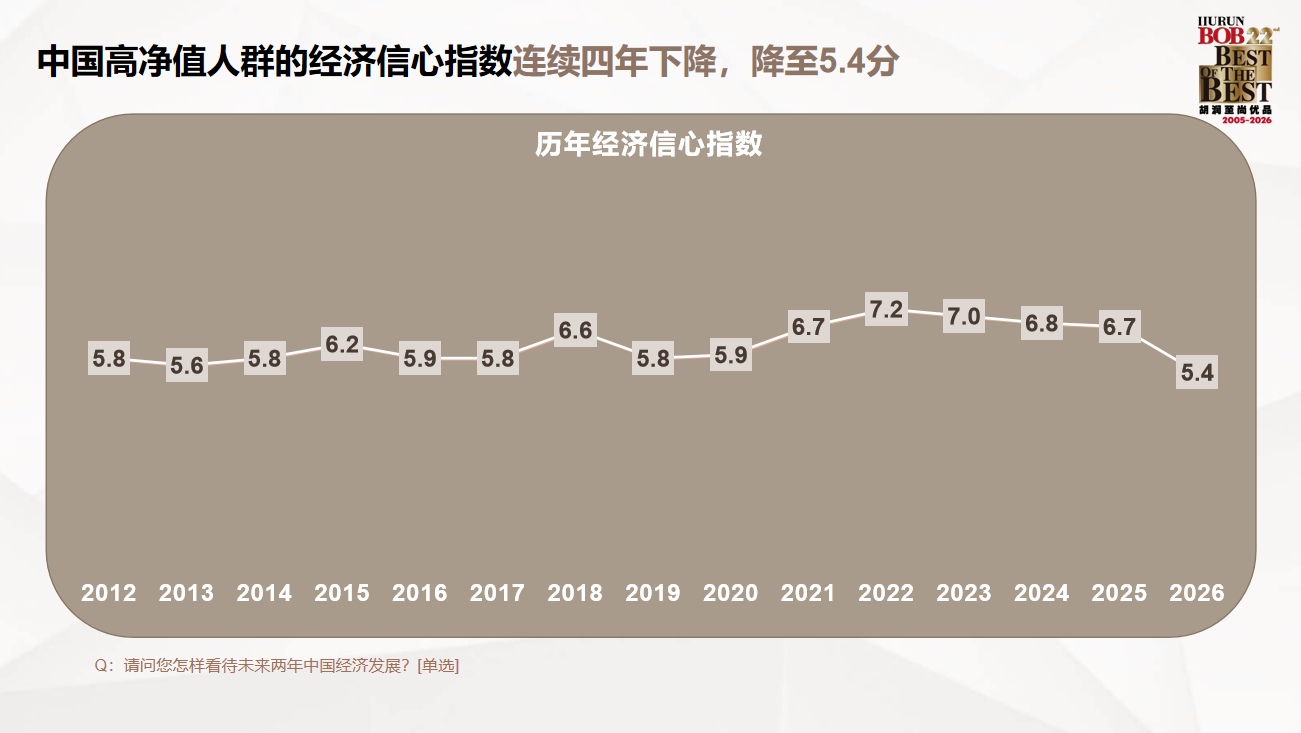 未来两年,26%的受访高净值人群对于中国经济“非常有信心”,59%认为“还算有信心”。分年龄段来看,U40(5.6分)和45岁以上(5.8分)受访者的经济信心指数高于整体水平(5.4分)。