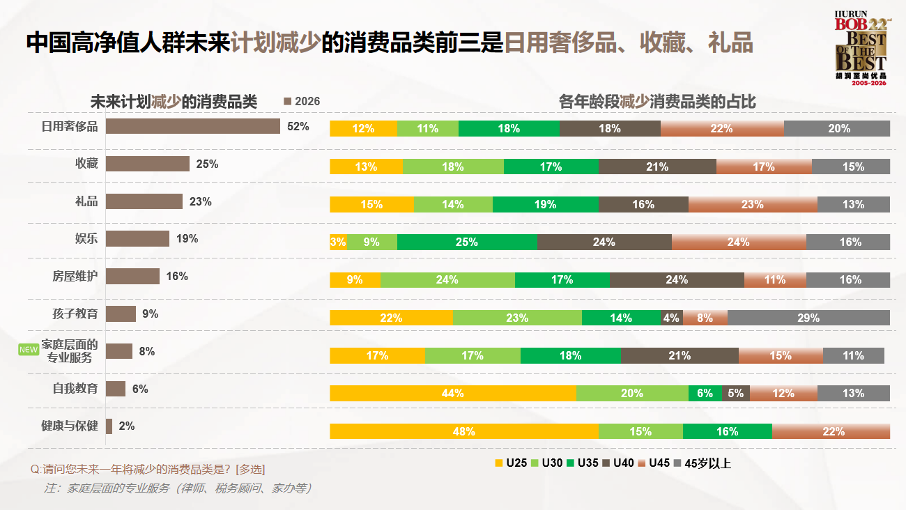 超过半数的高净值人士未来一年打算减少日用奢侈品开支,展现出理性务实的消费观念。分年龄段来看,U25计划减少健康与保健支出;U30计划减少房屋维护支出;U35、U40、U45都计划减少娱乐支出。