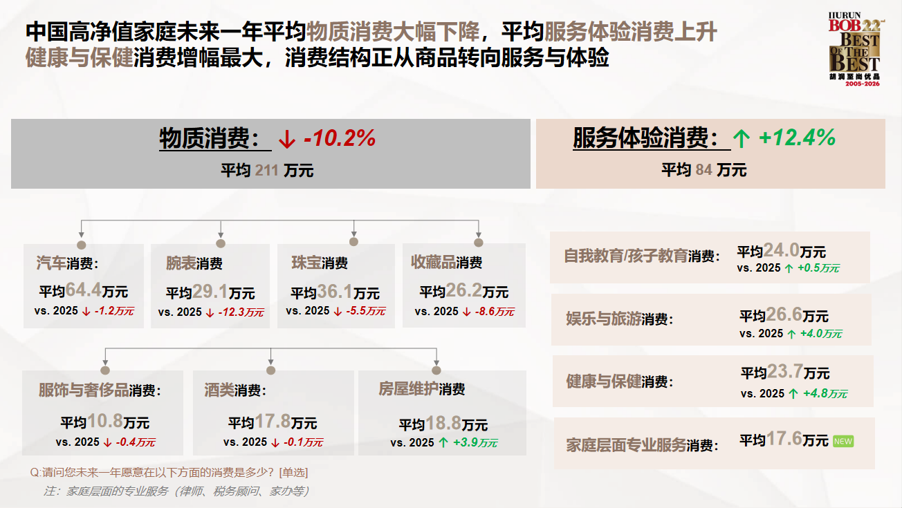 “‘体验至上’的消费观:计划年均物质消费如腕表、珠宝、收藏品大幅缩减,但对服务体验的支出意愿强劲增长,形成鲜明差异。增加消费的前三位分别是旅游、健康、孩子教育。”