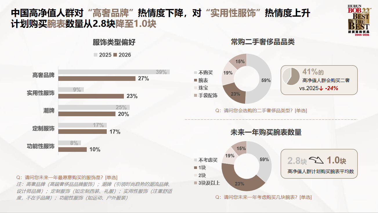 “消费更务实:超半数人群计划减少‘日用奢侈品’开支,对‘实用性服饰’的热情上升,购买腕表的热情明显下降,对二手奢侈品的整体热情大幅回落,显示出普遍的理性化消费倾向。”