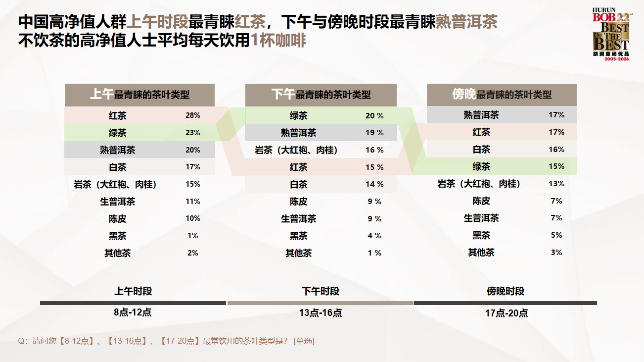 “高净值人群平均每天喝一杯咖啡,上午爱喝红茶,下午更爱绿茶和岩茶,傍晚相对喜爱熟普洱和白茶。和家人聚餐时,他们最青睐粤菜;和朋友聚餐时,日本料理是首选。”