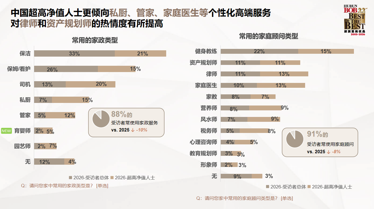在常用的家庭顾问方面,健身教练(22%)稳居首位,其次是资产规划师(11%)和律师(11%)。与去年相比,资产规划师的排名保持不变,律师的排名上升了三位,而家庭医生和营养师的排名则分别下降了两位和四位。今年,高净值人群对资产规划和风险管理的需求有所上升。
