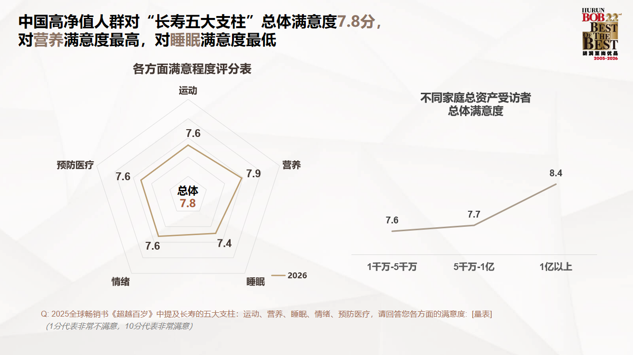 2025年全球畅销书《超越百岁》中提及长寿的五大支柱是运动、营养、睡眠、情绪、预防医疗。针对这五个方面,高净值人群的总体满意度是7.8分。其中,营养方面的满意度最高,达到7.9分;其次是运动、预防医疗、情绪,这三方面的满意度均为7.6分;睡眠方面的满意度排在末位,为7.4分。分资产量级来看,家庭总资产1千万至5千万的受访者总体满意度为7.6分,总资产5千万至1亿的受访者总体满意度为7.7分,总资产1亿以上的超高净值受访者总体满意度则达到8.4分。