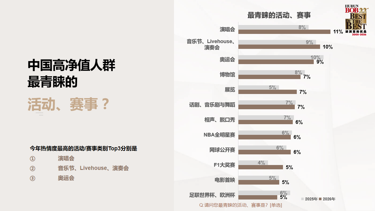 “今年高净值人群最喜欢的活动是演唱会,其次是音乐节/小型现场演出/演奏会。马上到来的冬奥也带动了奥运相关活动的热度,奥运会排在第三位。”