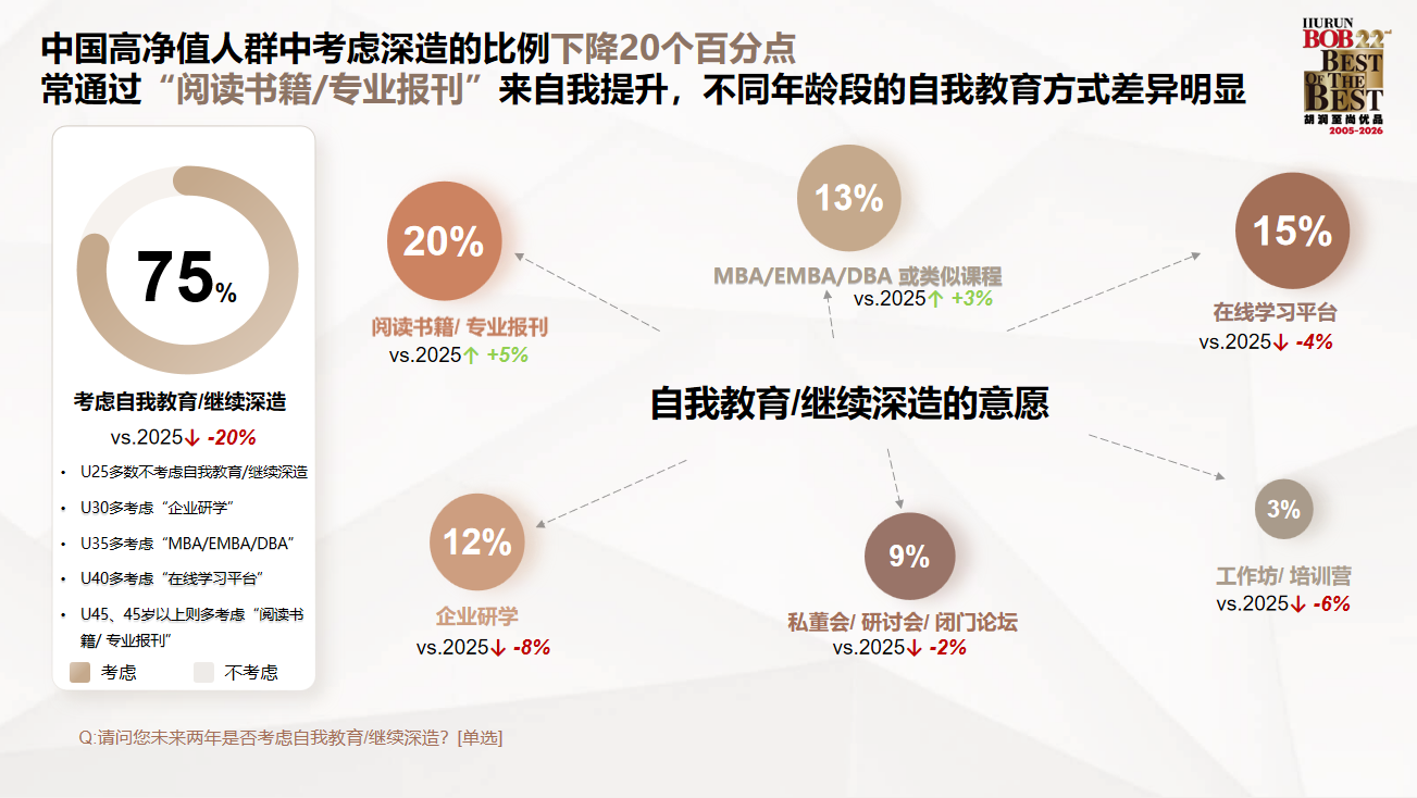 “代际差异显著,从消费偏好、信息获取到投资决策,各个年龄段展现出鲜明的个性化特征。U30和U25群体在消费方面更侧重娱乐与自我,对企业研学颇为青睐。U35和U45群体工作强度最大,是境外投资、继续深造如攻读MBA的主力,消费重心向孩子教育和家庭专业服务倾斜。45岁以上群体是健康保健、白酒消费的中坚力量,投资风格更保守,信赖BBA等传统品牌。”