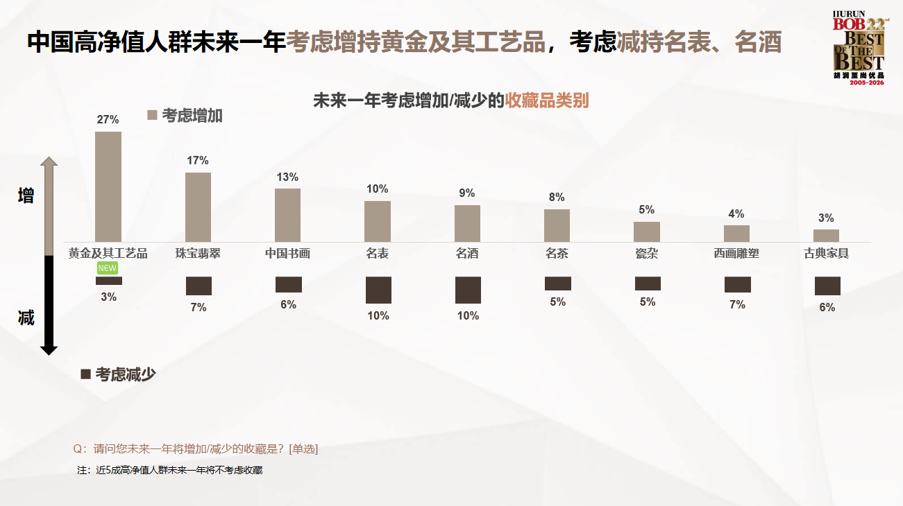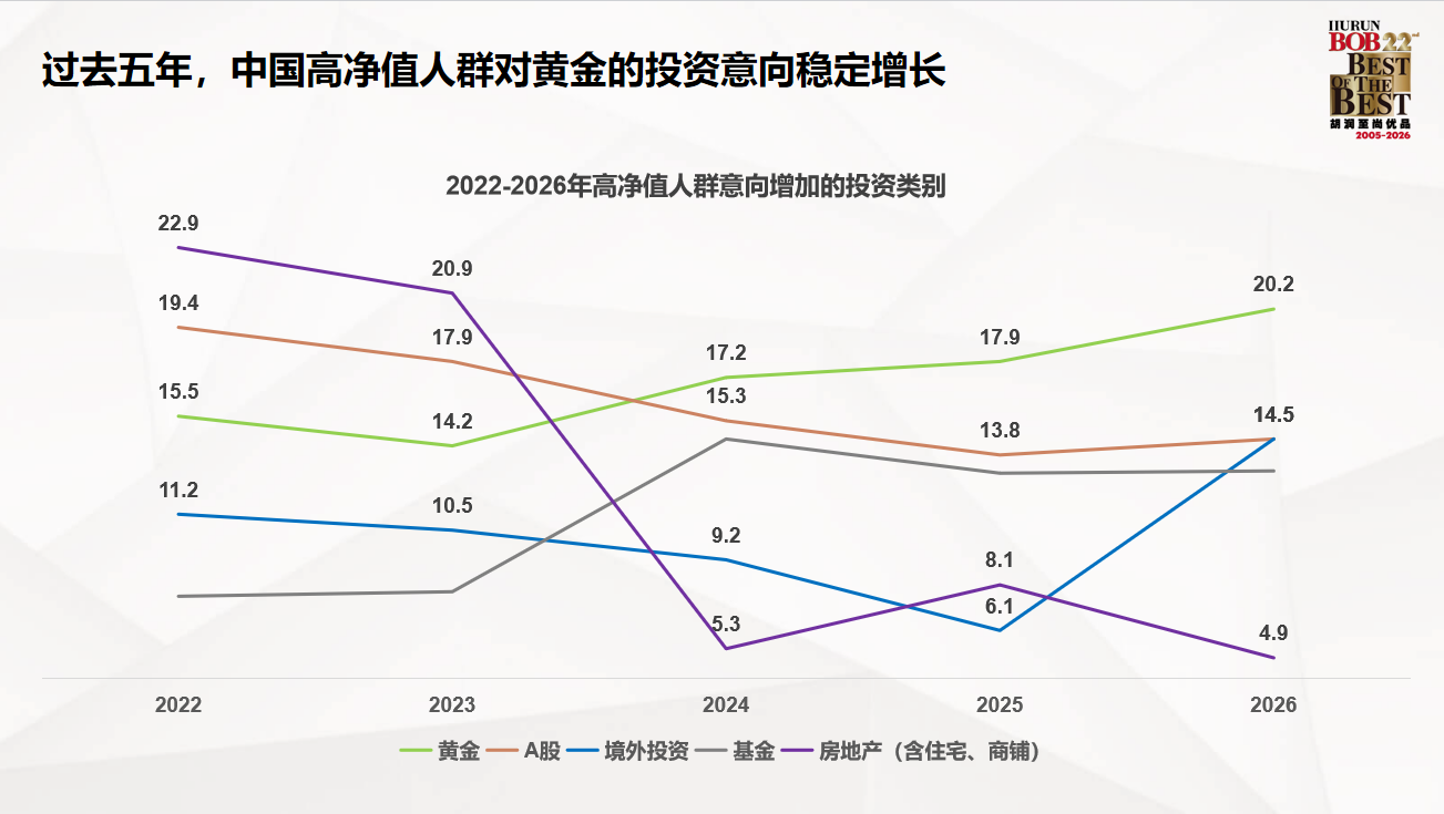 “投资与国际规划趋谨慎:未来一年,受访高净值人群最倾向增持的资产是黄金和境外投资如美股、港股,而考虑减持最多的是房地产、艺术品与收藏品,避险与寻求多元机会的趋势明显。此外,留学、移居意愿下降。值得关注的是,黄金已连续三年位列中国高净值人群投资偏好首位,期间,黄金价格从每克600多元上涨到了1100多元。”