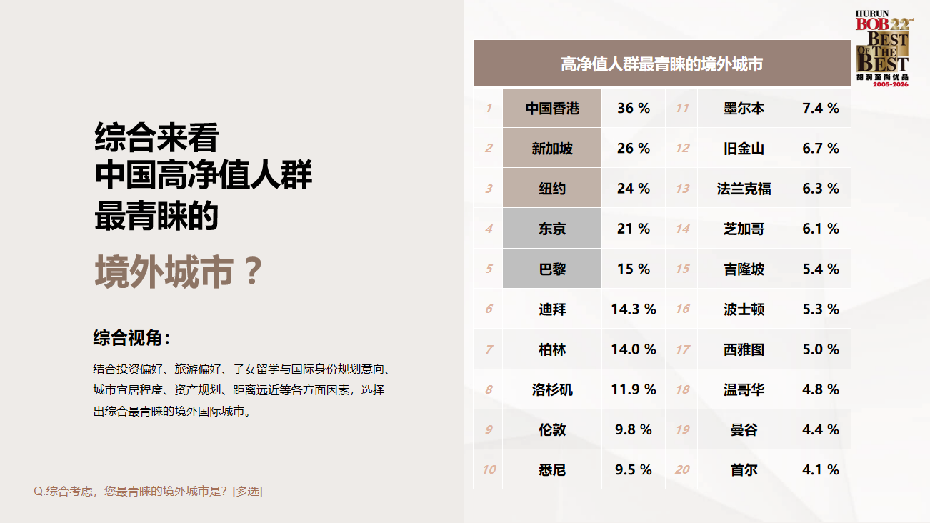 “国际身份规划意愿整体下降,新加坡、加拿大降温。84%的受访高净值人群考虑境外投资,但资产配置占比略有降低,境外投资地点首选中国香港。在高净值人群最青睐的境外城市中,香港也凭借绝对优势位居榜首,其次是新加坡;在美国,主要是纽约和洛杉矶较受欢迎;身为英国人,我很高兴伦敦能进入前十。在留学目的地方面,美国连续三年位居榜首,但热情度较去年微降2个百分点;英国位居第二,热情度下降了13个百分点,其中一大原因是英国对私校征收增值税,推高了英国留学成本。”