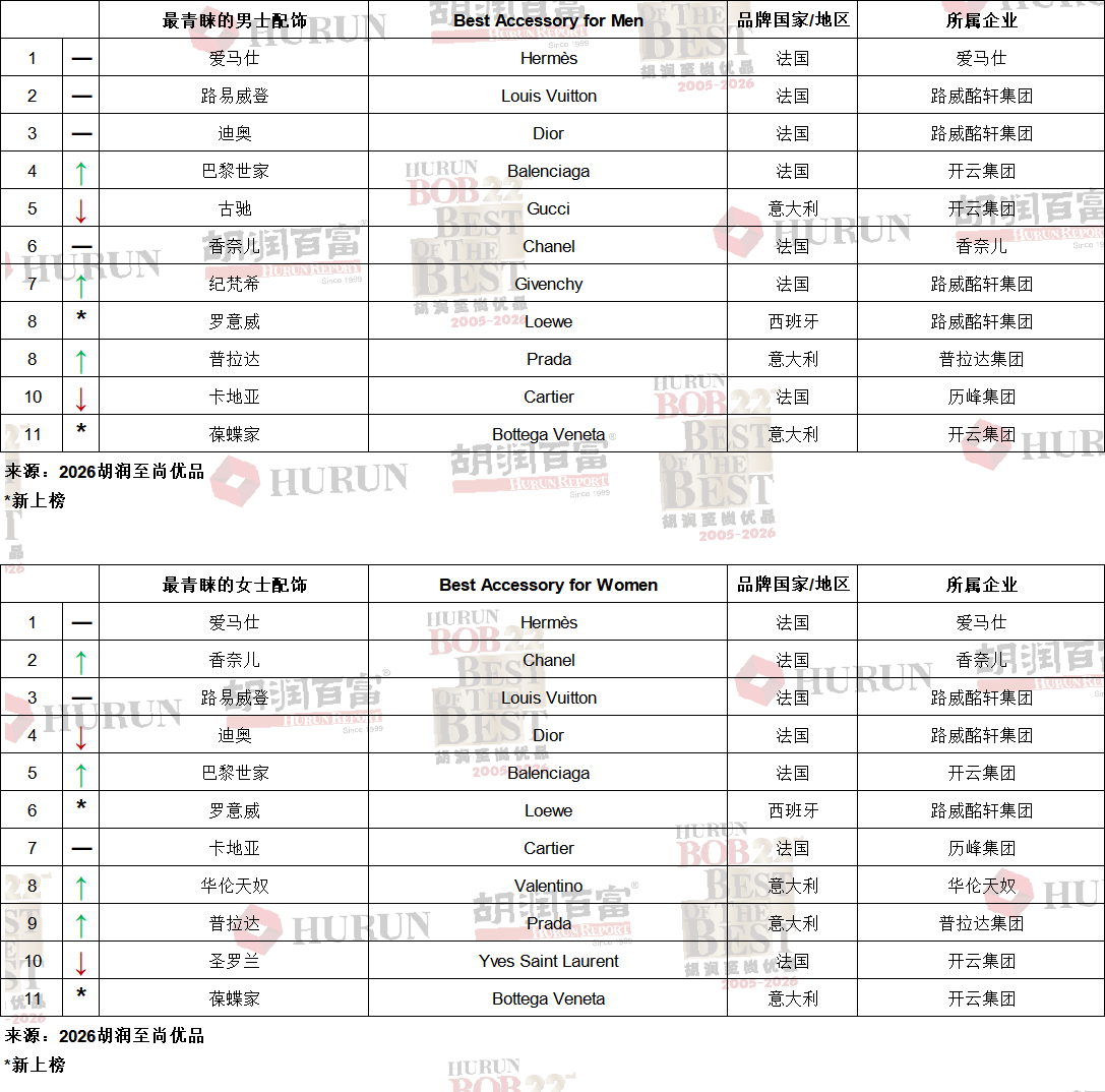 爱马仕同样连续第五年蝉联最受青睐的女士配饰,香奈儿攀升至第二位,路易威登保持第三。迪奥下降至第四位,巴黎世家升至第五位,华伦天奴跃升至第八位,卡地亚和普拉达分别位列第七和第九位,圣罗兰位于第十位。罗意威和葆蝶家成功跻身榜单,分别位列第六位和第十一位。