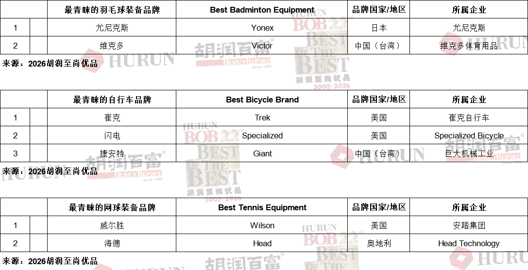 网球运动场景中,威尔胜荣获最受青睐的网球装备品牌,其次是海德。