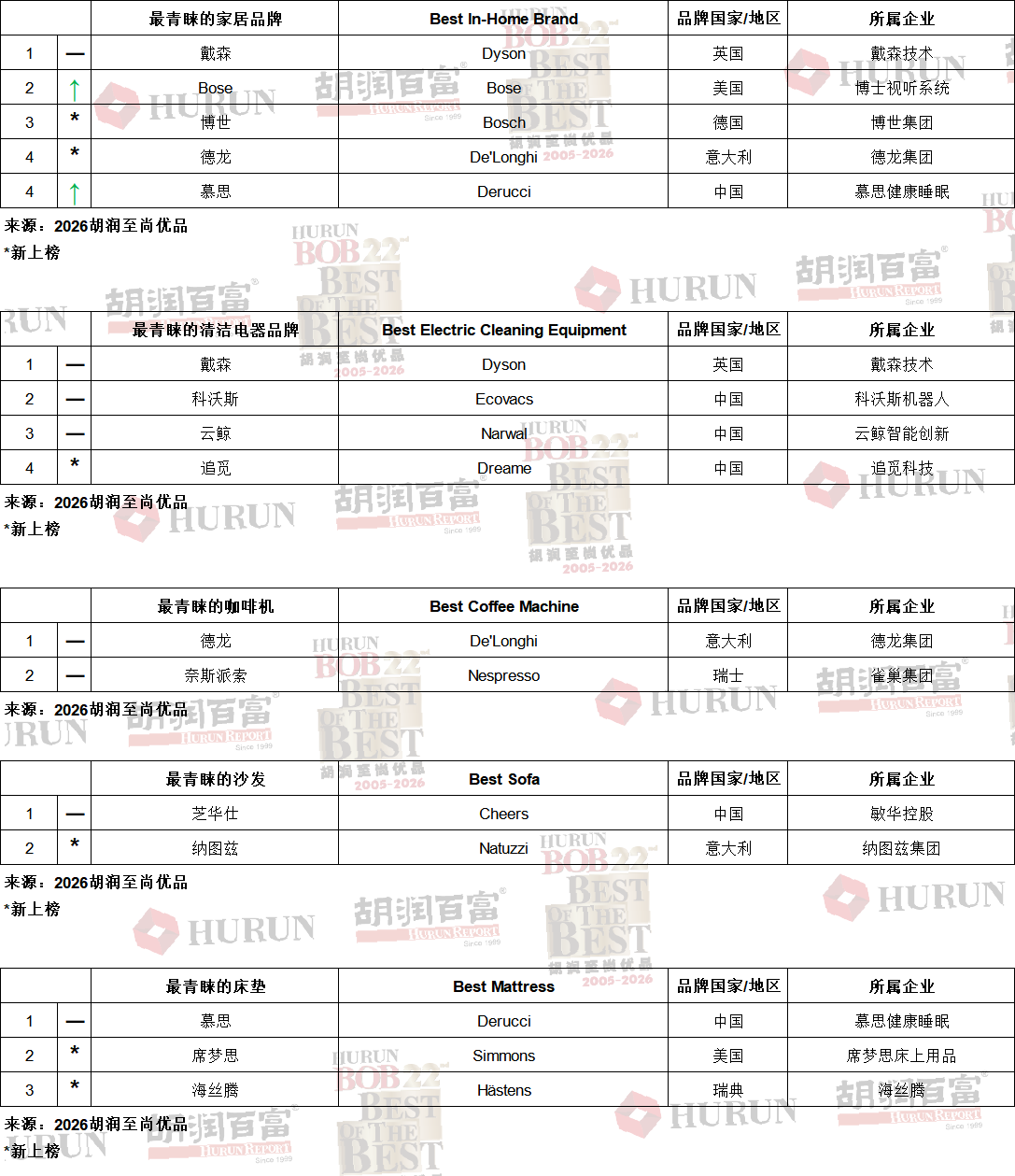 戴森蝉联最受青睐的家居品牌,博世、德龙成功跻身榜单前五名。戴森连续第五年蝉联最受青睐的清洁电器品牌第一名。德龙连续三年成为最受青睐的咖啡机品牌,奈斯派索位居第二。博世在高净值人群最青睐的料理机品牌中排名第一。芝华仕蝉联最受青睐的沙发品牌。傲胜蝉联最受青睐的按摩椅品牌,荣泰位居第二。慕思蝉联最受青睐的床垫品牌,席梦思和海丝腾分别位列第二和第三。Bose蝉联最受青睐的音响品牌,哈曼卡顿和马歇尔位列第二和第三。