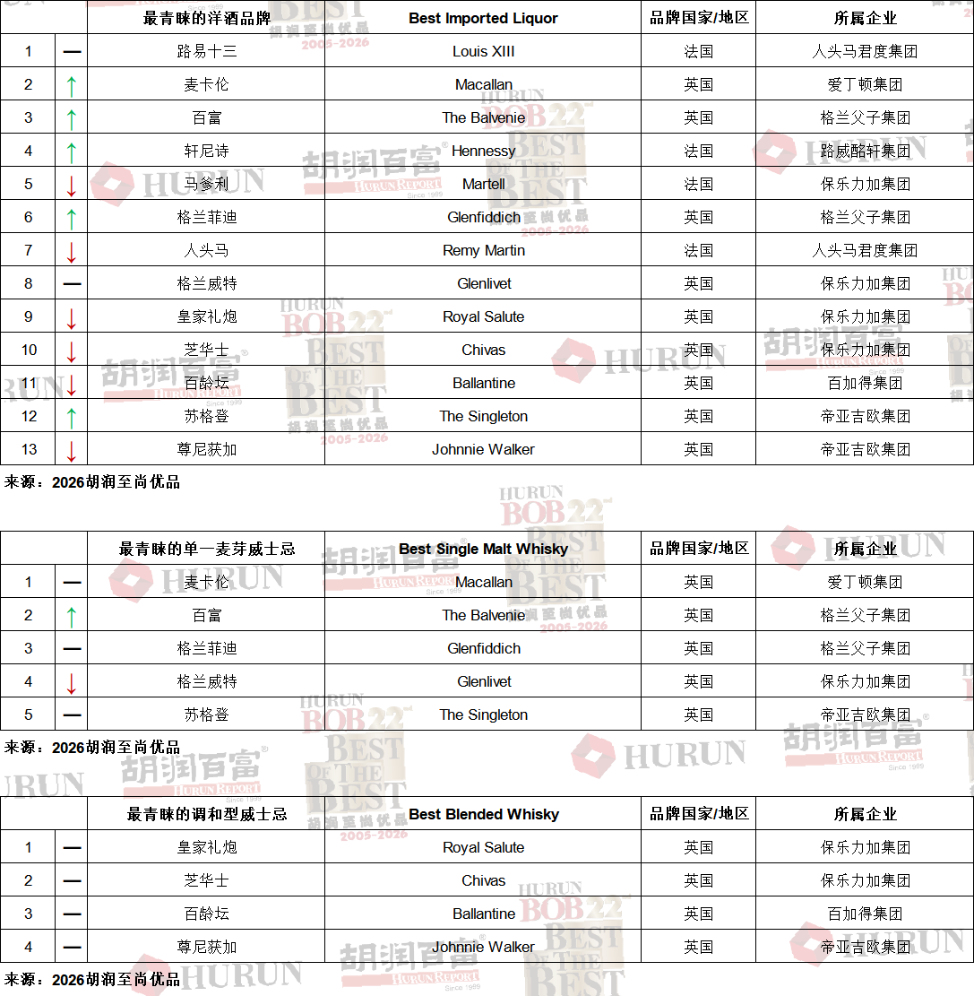 在洋酒品牌中,本次研究重点关注干邑白兰地和威士忌。路易十三蝉联最受青睐的洋酒品牌榜首,麦卡伦位列第二,百富上升至第三,轩尼诗升至第四。在单一麦芽威士忌中,麦卡伦继续蝉联首位,百富和格兰菲迪分别位列第二和第三,格兰威特降至第四。皇家礼炮连续四年荣膺最受青睐的调和型威士忌品牌。