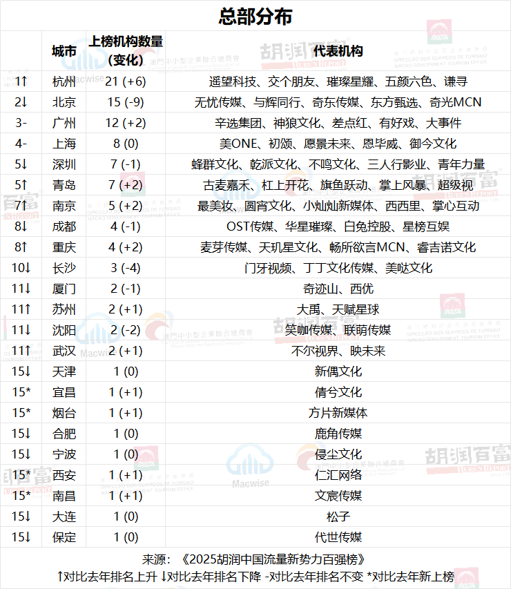《2025胡润中国流量新势力百强榜》上榜机构平均拥有2.8亿粉丝,平均签约达人530人。此次新上榜机构34家。同时有20家机构落榜,主要原因包括机构解散、核心达人离开等。百强机构分布于23个城市,其中七成位于杭州、北京、广州、上海、深圳、青岛这六大城市。有4家上榜机构的母公司为上市公司。