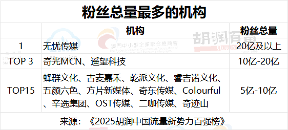 《2025胡润中国流量新势力百强榜》列出了中国最具价值的流量新势力机构,这里的“流量新势力”主要为MCN机构。流量新势力作为一个新兴行业,是指那些以内容生产和运营为基础,集网红达人、平台、厂商、供应链等资源于一体,发展包括短视频、图文、带货直播、短剧、播客、秀场直播、数字人内容、微综艺等不同业务形态,进行流量和内容变现为主的组织机构。