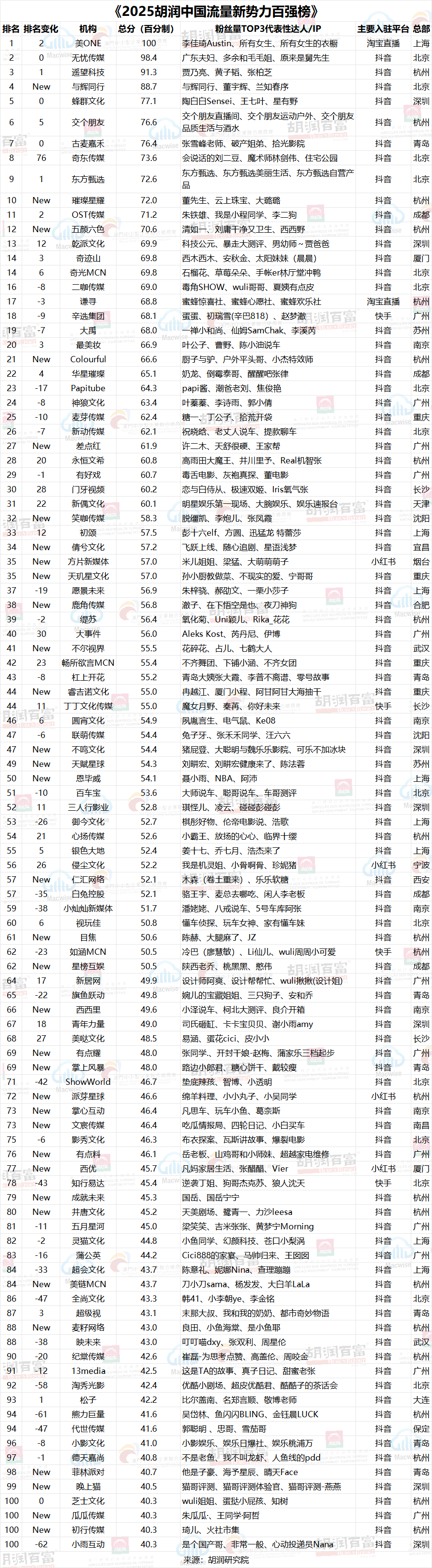 胡润研究院发布《2025胡润中国流量新势力百强榜》