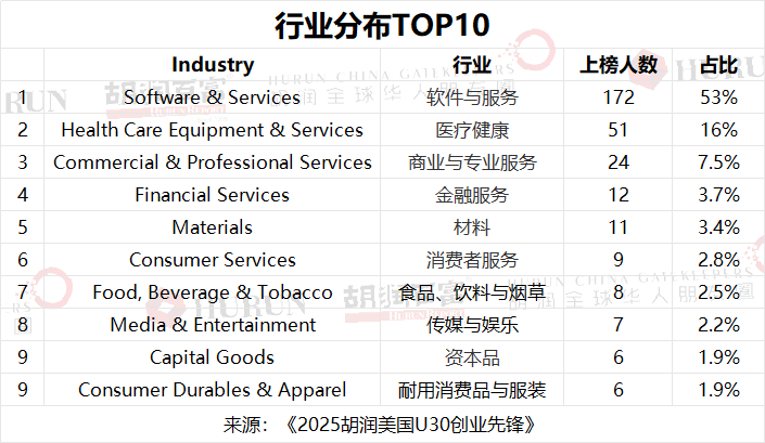 “从赛道来看,软件与服务,如 AI 大模型、SaaS服务,上榜人数最多,达172位;医疗健康,如药品研发、医疗器械,位居第二,有51位;商业与专业服务,如人力资源服务、法律服务,上榜24位。前三大赛道上榜人数占全榜的四分之三。”