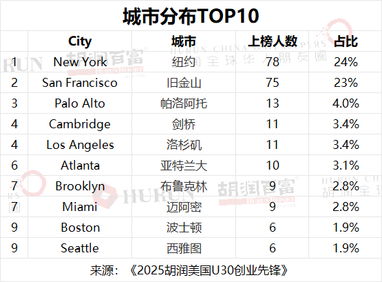 “纽约和旧金山分别有78人和75人上榜,遥遥领先。根据Startup Genome全球创业生态报告,硅谷与纽约位居全球创业环境前两位,均是独角兽企业高度集聚的创业高地。以硅谷为核心的旧金山湾区形成了高度活跃的创业生态,纽约则是全球重要的创新枢纽。”