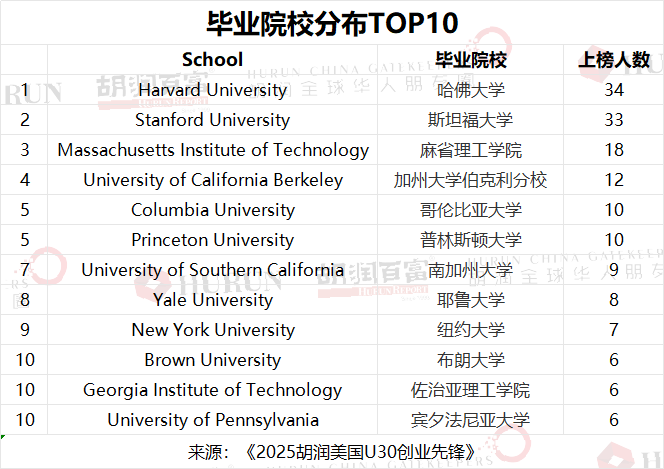 哈佛大学(34人)、斯坦福大学(33人)、麻省理工学院(18人)、加州大学伯克利分校(12人)、哥伦比亚大学(10人)贡献了最多的美国U30创业者