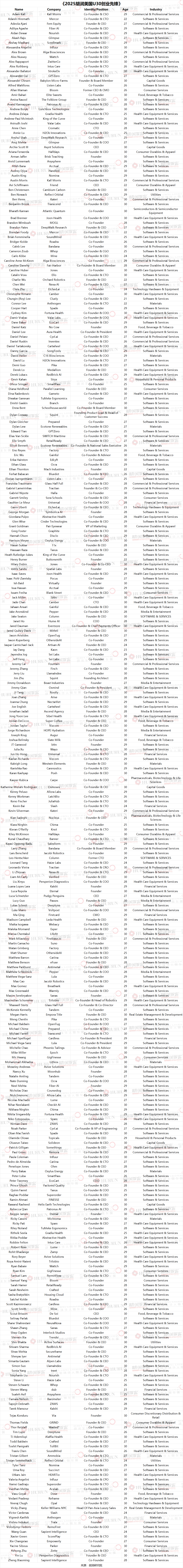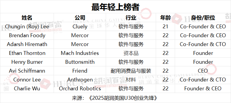 “U30创业者平均在23岁创办企业,至今已运营5年。最年轻的上榜者为21岁的 Chungin (Roy) Lee,他联合创立的Cluely成立于2025年4月,核心产品为会议专用AI工具,是榜单中最年轻的上榜企业。”